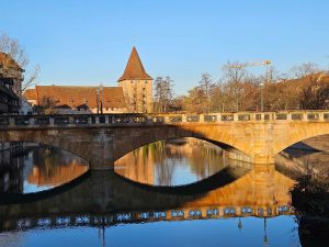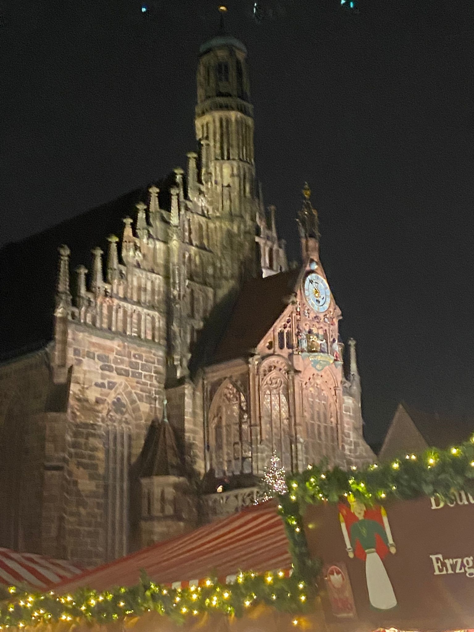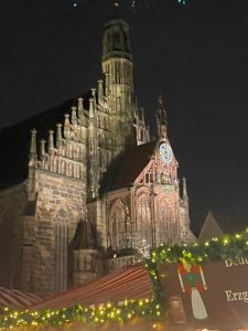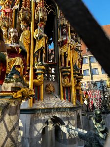 • Nous avons déambulé dans les ruelles pavées et multicolores de la vieille ville, admiré l’horloge astronomique de la Frauenkirche et les vitraux de l’église St Laurent, admiré la multitude de Chörlein (sortes de balcons/ chœurs fermés anciens accolés aux façades des maisons anciennes) et bien sûr, dégusté les spécialités locales (« Lebkuchen », « Gluhwein » et « Nurnberg Bratwurste »).